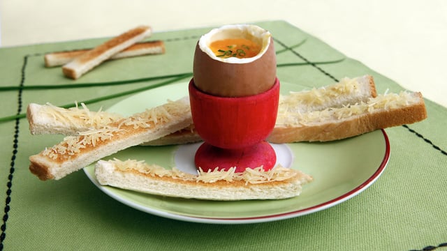 Parsemez votre œuf de gruyère râpé et de ciboulette. Trempez vos mouillettes et dégustez.
