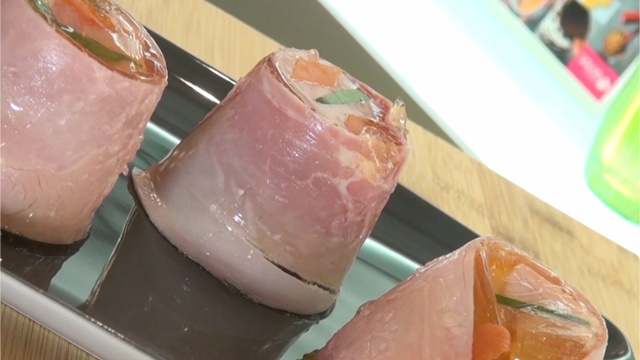 Décorez avec les losanges de tomate et d'estragon, puis placez le morceau de jambon dessus.