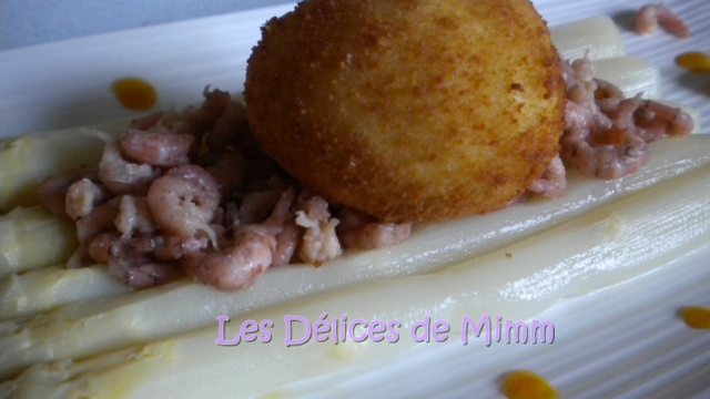 Une entrée délicieuse avec de bons produits : des asperges, des crevettes grises et des A