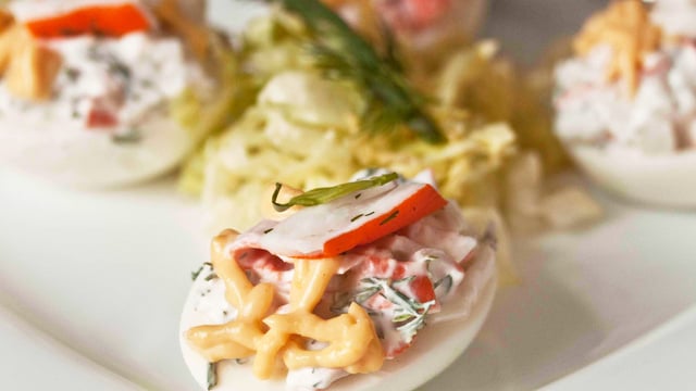 Garnissez chaque cavité des blancs d'oeuf de la préparation à base de surimi, à l'aide d'une cuillère à café ou d'une poche à douille.