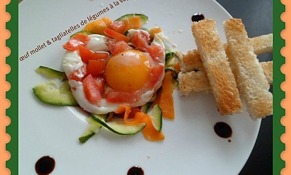 2 œufs extra frais1/2 tomate1 carotte1/2 courgette1 bouillon cube de légumes dilué dans 20 cl d'eau chaudeSel et poivre2 tranches de pain grillé1 gousse d'ailUn peu de crème balsamique pour la déco