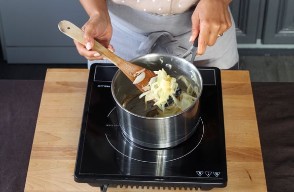 Dans une casserole, faites fondre les oignons émincés dans un peu de beurre et laissez-les compoter sur un feu doux en les remuant de temps en temps. Réservez dans un plat.