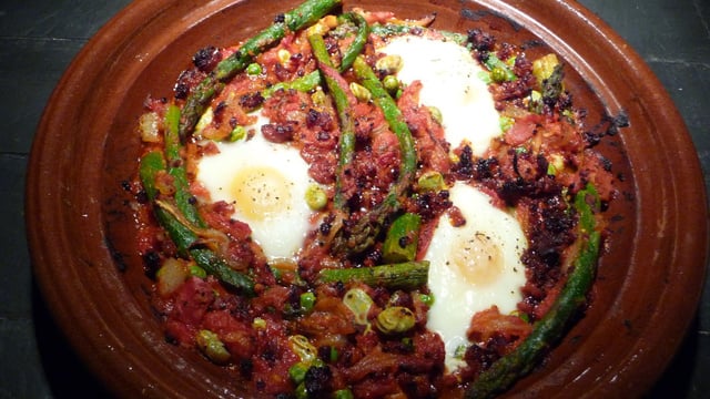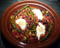 - 2Ajouter les pimientos , les asperges, les petits pois. Dans le mélange, faire 3 creux pour y casser les oeufs. Finir la cuisson dans le four à 200°C de 8 à 10 minutes.