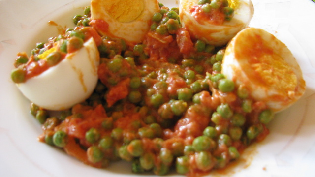 Oeufs durs avec petits pois, tomates concassés et curry.