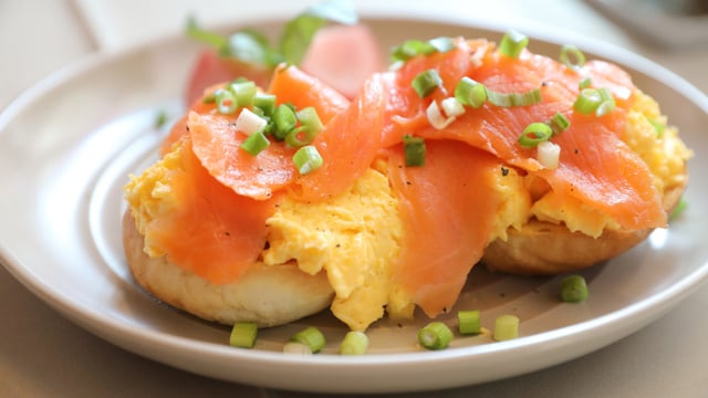 Hors du feu, versez la crème, poivrez et mélangez. Répartissez sur les muffins grillés, ajoutez le saumon fumé, la ciboulette. Poivrez et servez.