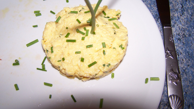 Battez très légèrement les œufs dans un bol, surtout qu'ils ne deviennent pas mousseux, assaisonnez de sel et de poivre, ajoutez les herbes et la moitié du beurre en parcelles. Faites fondre l'autre moitié dans un bain-marie (à confectionner avec deux casseroles si vous n'en avez pas un vrai) puis ajoutez les œufs. Tournez à la cuiller de bois jusqu'à obtention d'une consistance crémeuse. Servez aussitôt
