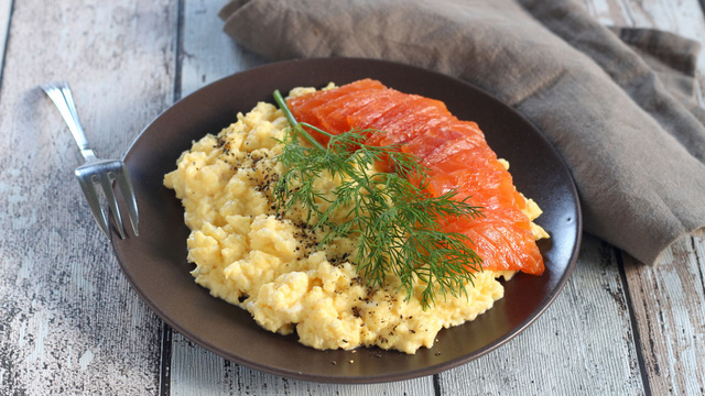 Ajoutez le gravlax de saumon, l’aneth ciselé et servez.