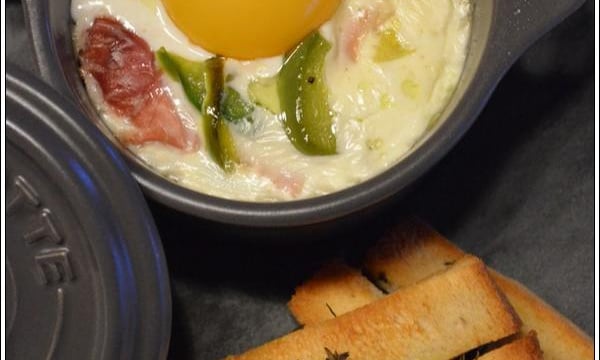 Enfournez à 200° pendant 10min. Puis mettez le jaunes et fermez le couvercle de la cocotte et servez avec quelques mouillettes.