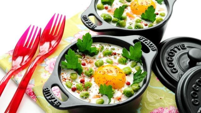 Ajouter les pois qui avaient été réservés, pour qu'ils aient une apparence bien verte sur le dessus de la préparation, poser les couvercles et cuire deux minutes au four à 180°. Sortir du four, ajouter les pluches de persil et les baies roses, servir aussitôt ! Avec cette méthode les jaunes d'oeufs restent bien coulants, sans avoir recours au bain marie...