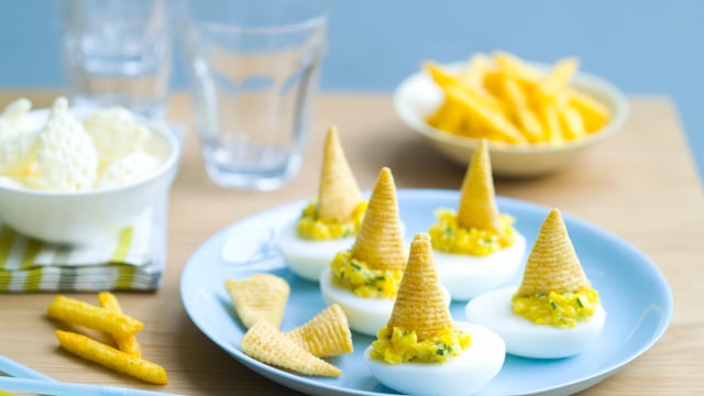 Remplissez les blancs d’oeufs durs de ce mélange puis décorez avec un soufflé au bacon et des soufflés en forme de frite.
