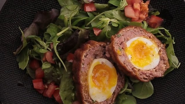 Des oeufs durs enveloppés dans de la viande, panés puis frits.