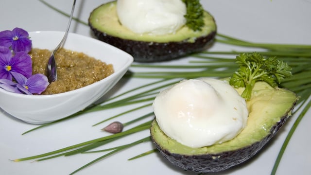 Poser chaque œuf sur le demi avocat.
