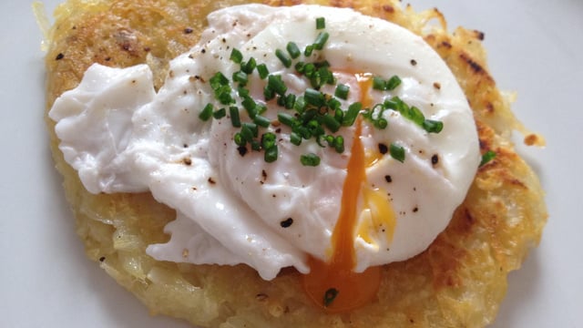 Au bout de trois minutes sortir le premier œuf et ainsi de suite et les déposer sur une assiette au bain Marie pour garder la chaleur. Quand tous les œufs sont cuits, mettre une galette dans chaque assiette, déposez dessus un œuf poché, sel, poivre et de la ciboulette ciselée. Servez de suite.
