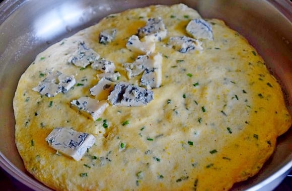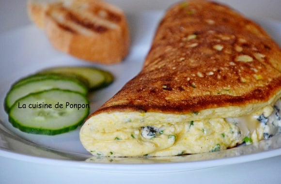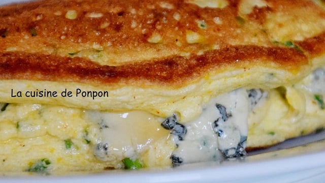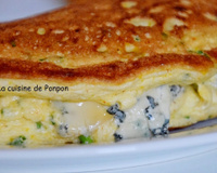 NB: C'est vraiment une belle découverte que cette omelette savoureuse, nuageuse et délicieuse. J'ai eu un petit souci lorsque j'ai mélangé les jaunes avec la farine, l'apparition de grumeaux. Il a fallu que je tamise le tout... Donc veillez à mélanger gentiment (j'ai été un peu brute je pense) et peut-être même ajouter un peu de lait. Comme je n'avais pas de Fourne d'Ambert, j'ai utilisé du Bleu d'Auvergne.