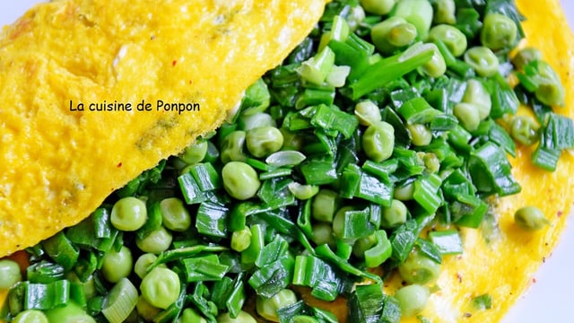 Laver et essuyer la poêle et la remettre sur le feu avec 1 cs d’huile d’olive. Verser les œufs battus et faire cuire l’omelette plus ou moins baveuse, selon le goût désiré. Déposer les petits pois et les cébettes au milieu, 1 min avant la fin de la cuisson. Rouler l’omelette sur un plat et servir.