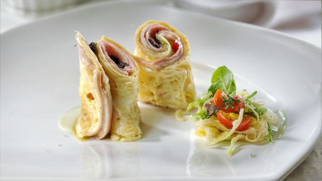 Roulez l'omelette avec le fromage et le jambon côté intérieur du roulé.