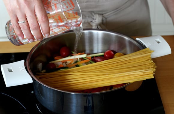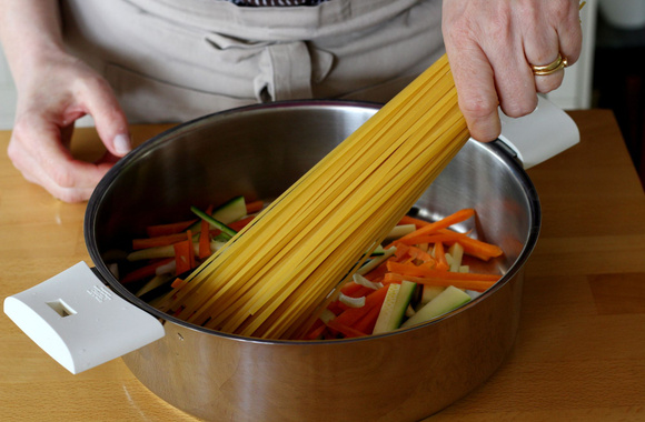Mais qu'est-ce que c'est ? On savait déjà qu'il est possible de faire cuire des pâtes courtes par absorption. Avec les One Pot Pasta, on va plus loin car on met absolument tous les ingrédients dans une sauteuse, y compris les pâtes, on ajoute du bouillon et une dizaine de minutes après, c'est prêt et on n'a même pas besoin d'égoutter. Génial, non ?