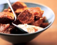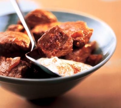 - 3Saupoudrer de paprika, arroser de bouillon, verser la pulpe de tomate et les raisins secs.Mélanger, saler et poivrer puis couvrir et laisser cuire 1 h à feu doux.