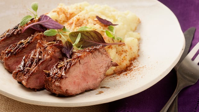 Mettre une poêle à chauffer avec l'huile d'olive et les graines de cumin. Saisir la viande 5 minutes de chaque côté. Laisser reposer 2 minutes sur la planche avant de découper. Servir avec la purée.