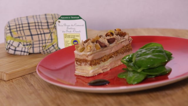 Au moment de servir, dressez les opéras. Disposez le reste de préparation au foie gras dans une poche à douille équipée d'une douille cannelée. Décorez le dessus de l'opéra avec la préparation. Parsemez les noisettes, amandes et morceaux de figues et raisins sur le dessus.