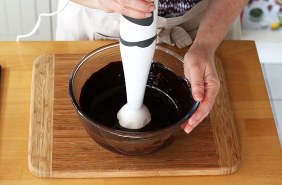 4Lissez le mélange à l'aide d'un mixeur plongeur puis versez dans un moule à cake en silicone ou dans un moule à cake recouvert de film étirable.