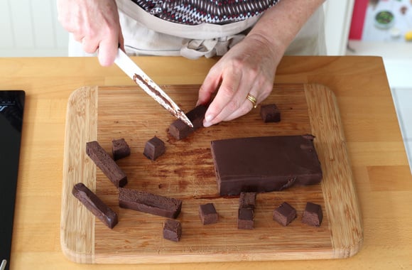 5Réservez au frais une nuit, démoulez et coupez en cubes.