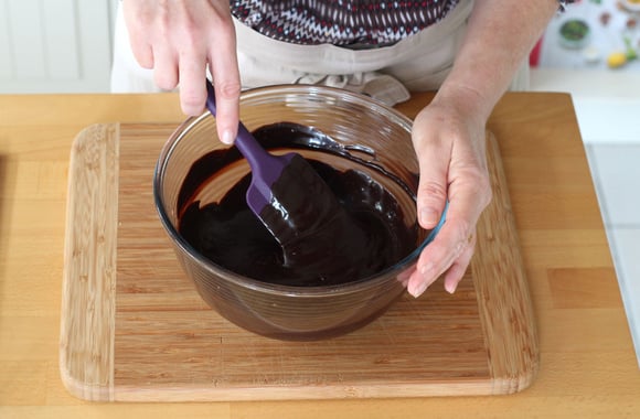 Faites fondre le chocolat et faites frémir le mélange miel et crème liquide. Versez le mélange à base de crème sur le chocolat fondu en 3 fois et mélangez à chaque fois vigoureusement avec une maryse.