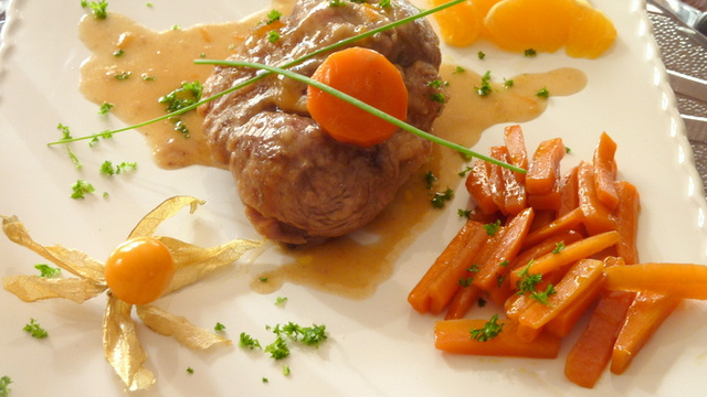 Un viande confite dans un jus de gingembre,oranges clémentines confites, le tout accompagné de carottes glacées au miel de safran.