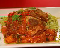 - 3DressageAu moment de servir, parsemer chaque portion de gremolata, accompagné de pâte fraîches, j'ai choisi des pâtes au basilic qui s'accordent très bien avec les aromates présents dans la sauce