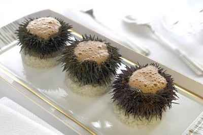 - - Ouvrir les oursins aux ciseaux sur la partie supérieure, retirer délicatement tout ce qui est à l'intérieur.- Récupérer uniquement les lobes.- Les passer un peu sous l'eau pour les nettoyer.- Nettoyer bien aussi la coque d'oursin.- Réaliser la purée de fenouil : on va émincer le fenouil. Le faire revenir à l'huile d'olive.Lui rajouter un petit peu de curry. Ajouter le fond blanc de volaille et le jus de coquillage. Cuire 20 minutes à frémissement.Passer au tamis ou mixer en ajoutant la crème fraîche pour obtenir une purée lisse.- Au fond de la coque d'oursin, mettre de la purée de fenouil au curry.- Mettre un peu de gelée de crustacés sur la purée.- Poser les lobes d'oursins et rajouter un petit peu de gelée de crustacés.- Au dernier moment, ajouter une réduction de jus de pommes.