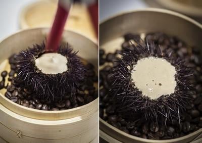 Vider les oursins, en prenant soin de bien garder le jus. Réaliser le sabayon au café : dans la cuve du Thermomix, mettre les œufs, le café, le beurre et le sel. Mixer à 60°C pendant 4 minutes 30.
