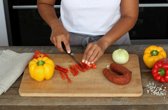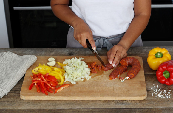 2Pelez et émincez l'oignon et l'ail, émincez le chorizo.