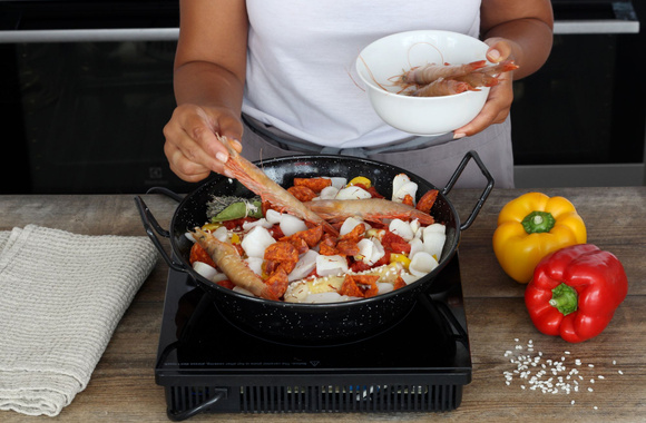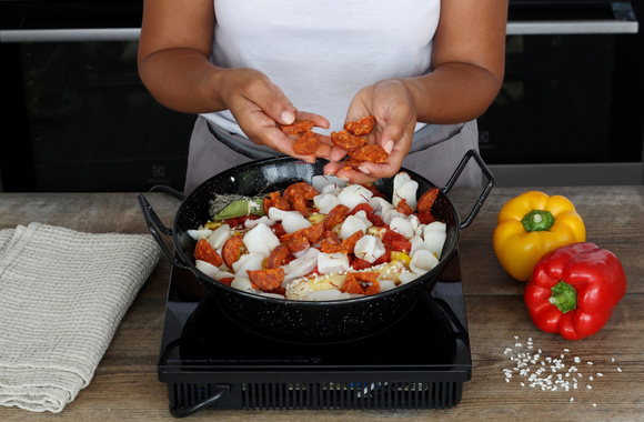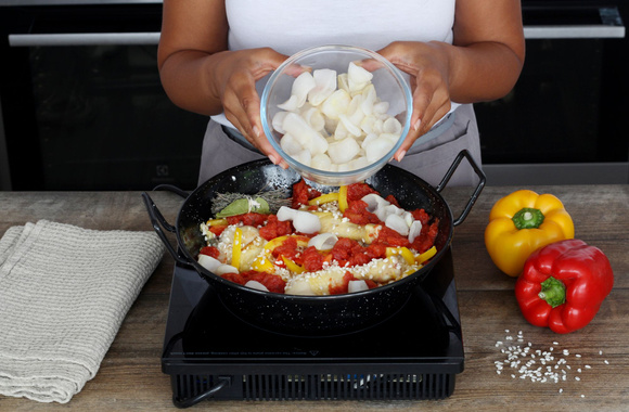 6Incorporez les calamars coupés en rondelles, les dés de tomates, le safran, le thym et le laurier.