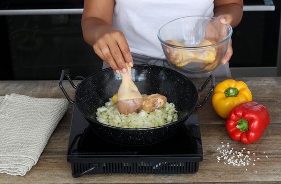 3Dans une grande cocotte allant au four, chauffez l'huile à feu moyen. Faites-y dorer l'oignon émincé et les pilons de poulet.