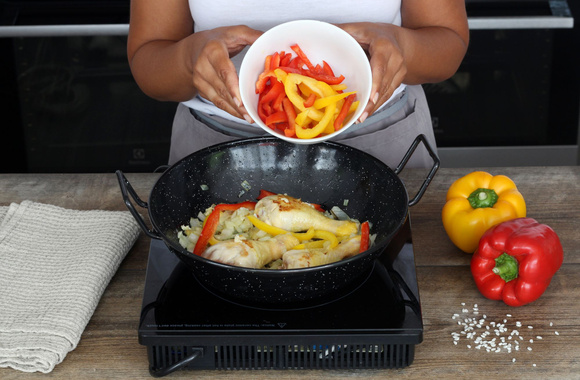 4Ajoutez l'ail et les poivrons et laissez mijoter 2 à 3 minutes.
