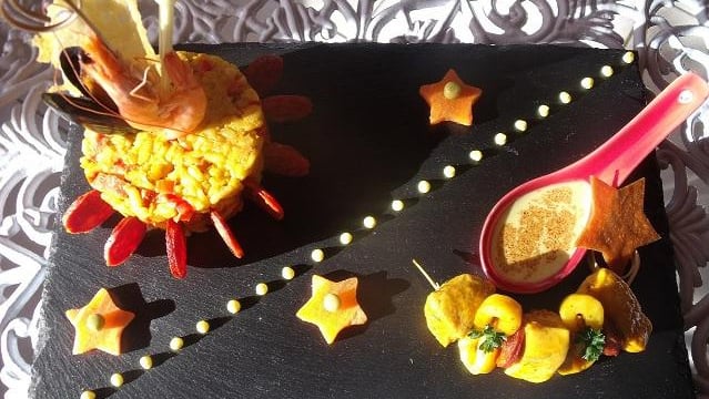 Au moment de servir, décorez le risotto dressé dans un cercle de des tranches de chorizo poêlées. Intercalez-en aussi quelques-unes sur les brochettes « poulet-anneaux de calamars ». Servez avec la crème onctueuse de moules. Bonne dégustation.
