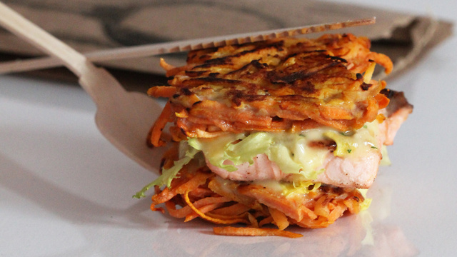Paillassons de patate douce façon burger, garni de saumon à la cardamome, frisée et mayonnaise oignon/estragon.