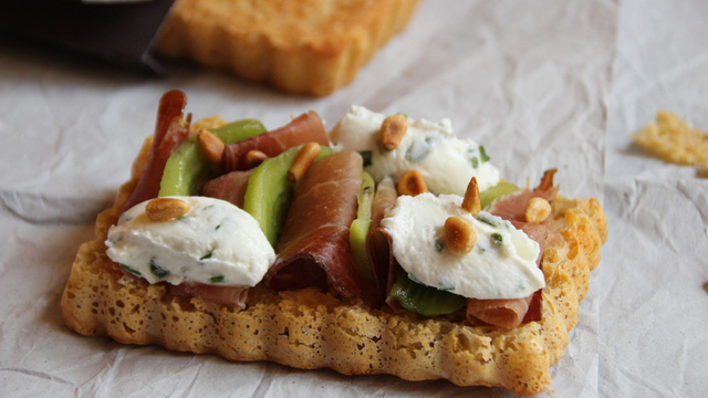 Une tartine faite sur du pain croustillant dans lequel se cache des dés de Saint-Agur. La saveur forte et fumée du Speck se marie à merveille avec la douceur du kiwi. Le carré frais, détendu avec du citron vert et de la ciboulette apporte de la fraîcheur en bouche. Enfin les pignons laissent une note de gourmandise et de croquant.
