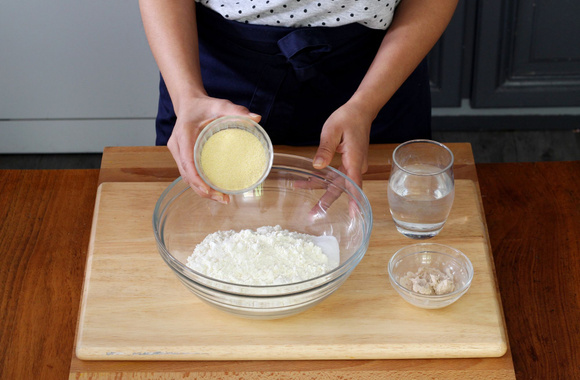 2Mettez la farine et la semoule dans un saladier, ajoutez-y la levure diluée et le sel.