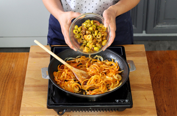 7Ajoutez les olives égouttées, mélangez.