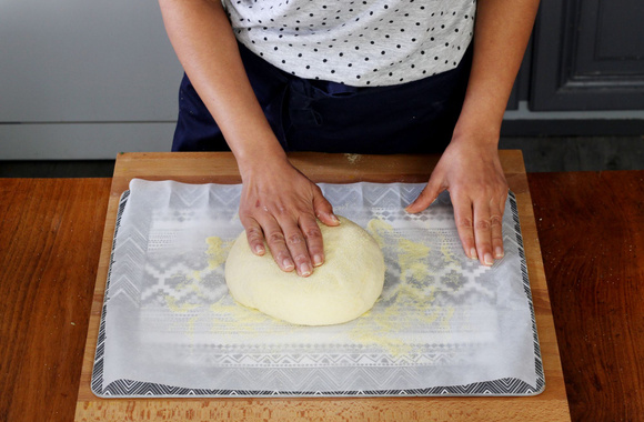 11Façonnez le pain en boule, déposez-le sur du papier sulfurisé (le papier vous aidera à ce que la pâte ne colle pas lorsque vous voudrez la décoller pour la mettre à cuire) et laissez reposer 5 min. Saupoudrez le pain avec de la semoule encore une fois, puis aplatissez-le avec la paume de votre main jusqu'à avoir un disque d'une épaisseur d'1 cm. Couvrez le pain d'un torchon propre puis laissez lever 15 min.