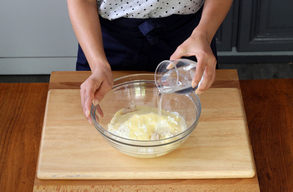 3Ajoutez l'eau tiède que vous verserez petit à petit tout en ramenant la farine au centre.
