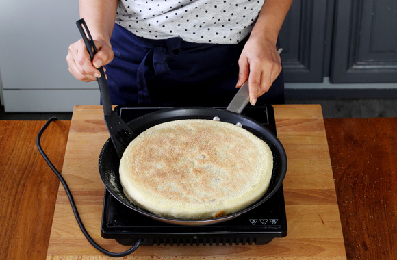 Laissez cuire sur feu doux jusqu'à ce que le dessous du pain soit doré puis retournez le pain pour faire cuire l'autre face.