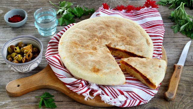 9Saupoudrez le plan de travail avec un peu de semoule, dégazer la pâte puis aplatissez-la en un cercle. Mettez la garniture au centre.