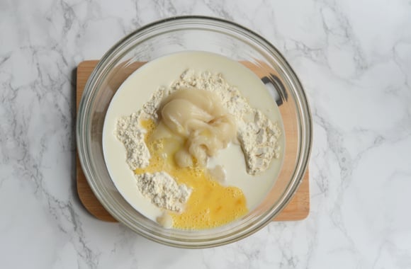 Dans un saladier, mélangez le Tangzhong, la moitié de l'œuf battu et le lait.Dans un autre saladier, mélangez la farine, la levure délayée dans un peu d’eau tiède, le sucre et le lait en poudre.