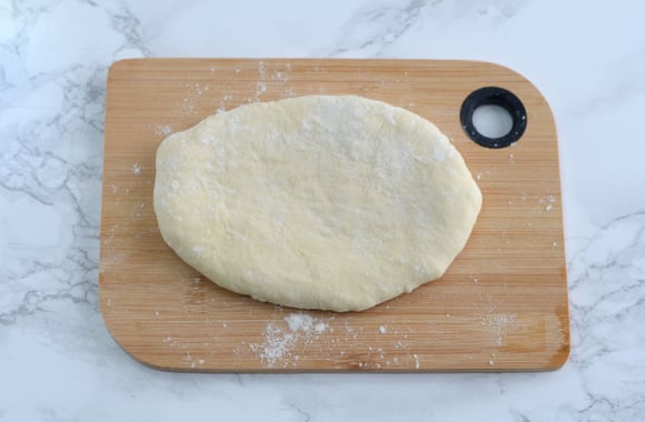 Prenez chaque pâton et étalez-le en forme ovale. Repliez les bords en portefeuille. Etalez à nouveau à l’aide d’un rouleau à pâtisserie.