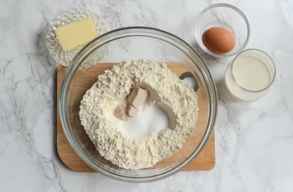 Ajoutez le beurre mou et amalgamez le tout jusqu’à ce que la pâte soit souple (Vous pouvez très bien utilisez votre robot pour l’étape du pétrissage).