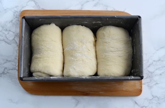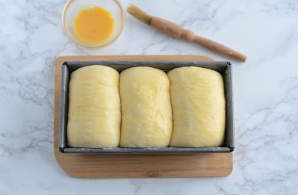8Disposez-les dans un moule à cake beurré ou chemisé de papier sulfurisé. Couvrez d’un linge propre et laissez lever 1 heure.
