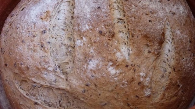 Entailler avec une lame de rasoir et saupoudrer de farine. Mettre un gros bol d'eau froide en bas du four. Enfourner 10 min à 230°C puis 20 à 25 min à 210°C (selon la taille de votre pain et de votre four.