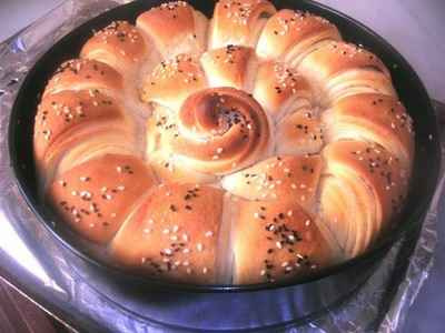 Je beurre légerement au pinceau les pièces et je parseme de graines de sésame et/ou nigelle, je laisse encore lever 30 min avant d'enfourner a 160° pendant environ 30 min.